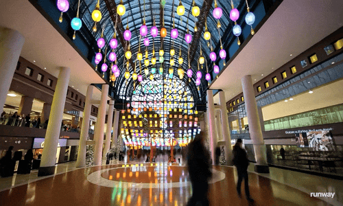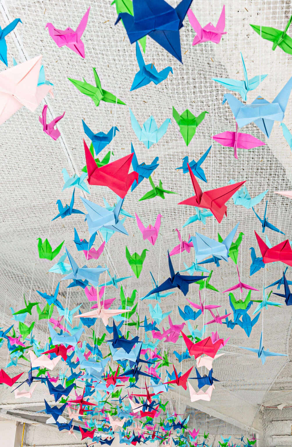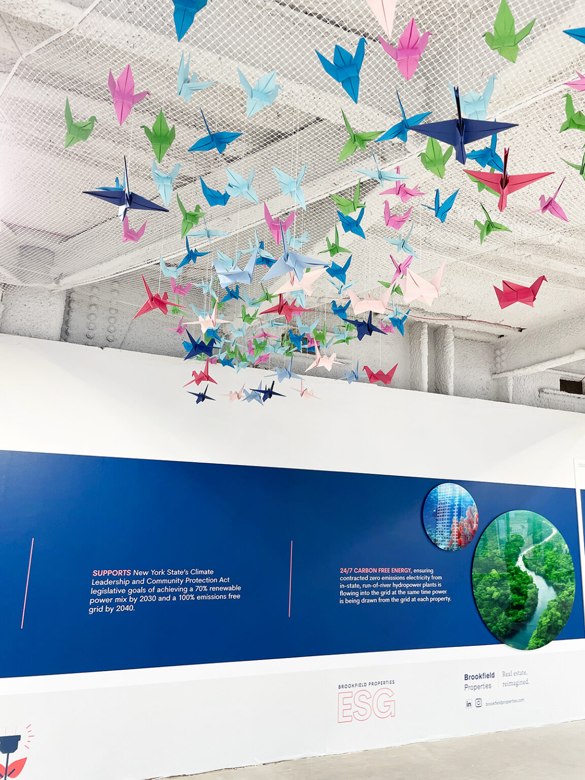 Over 2,000 hand-folded origami cranes made from recycled paper floated above the ESG area, creating a dynamic, kinetic installation that symbolized transformation and hope.